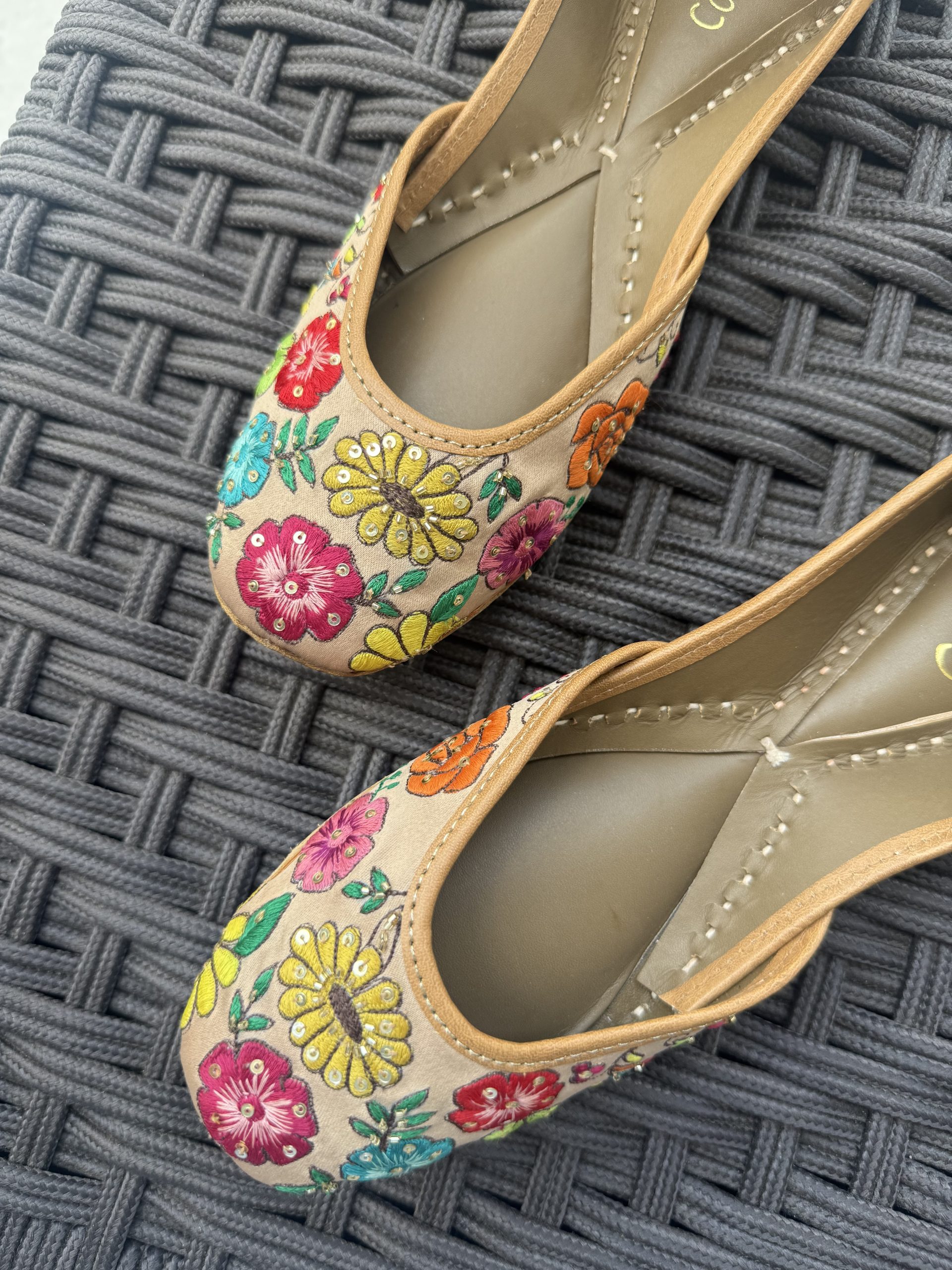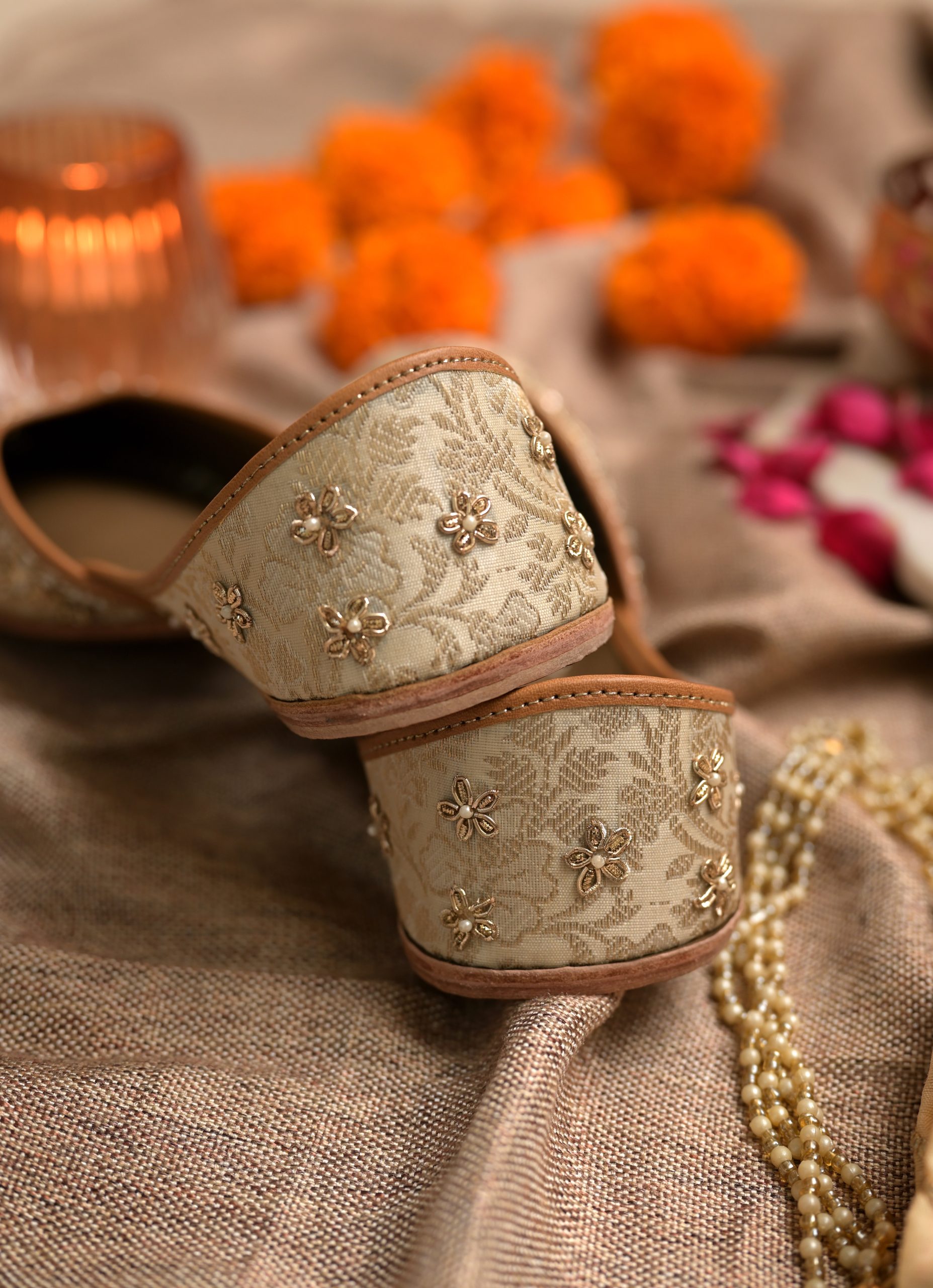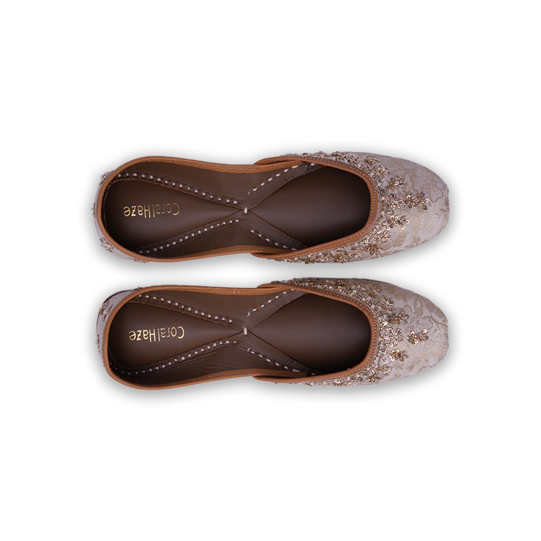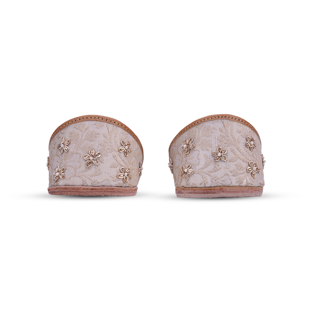 These stunning Juttis feature intricate hand-embroidered zardozi work on the front, complemented by scattered motifs at the back.
