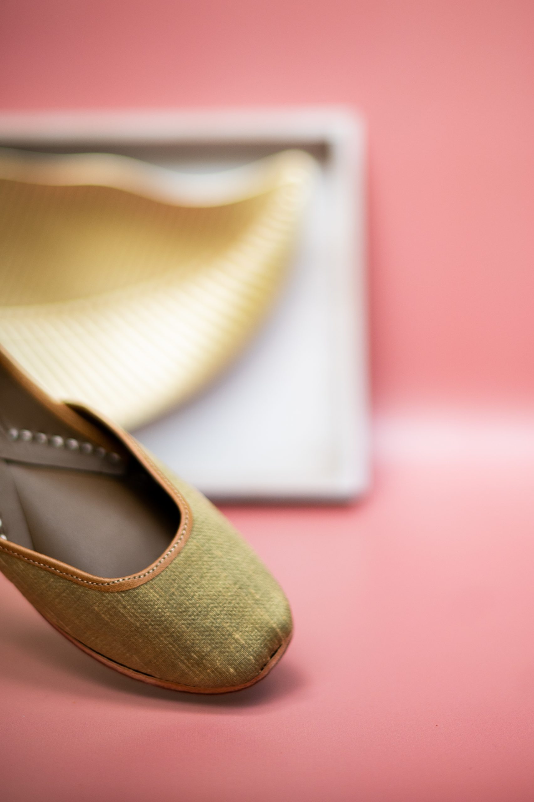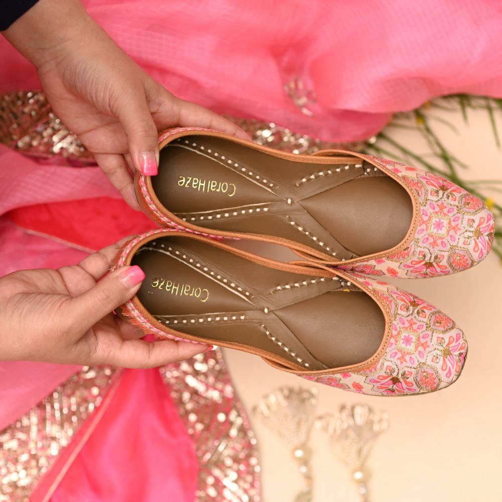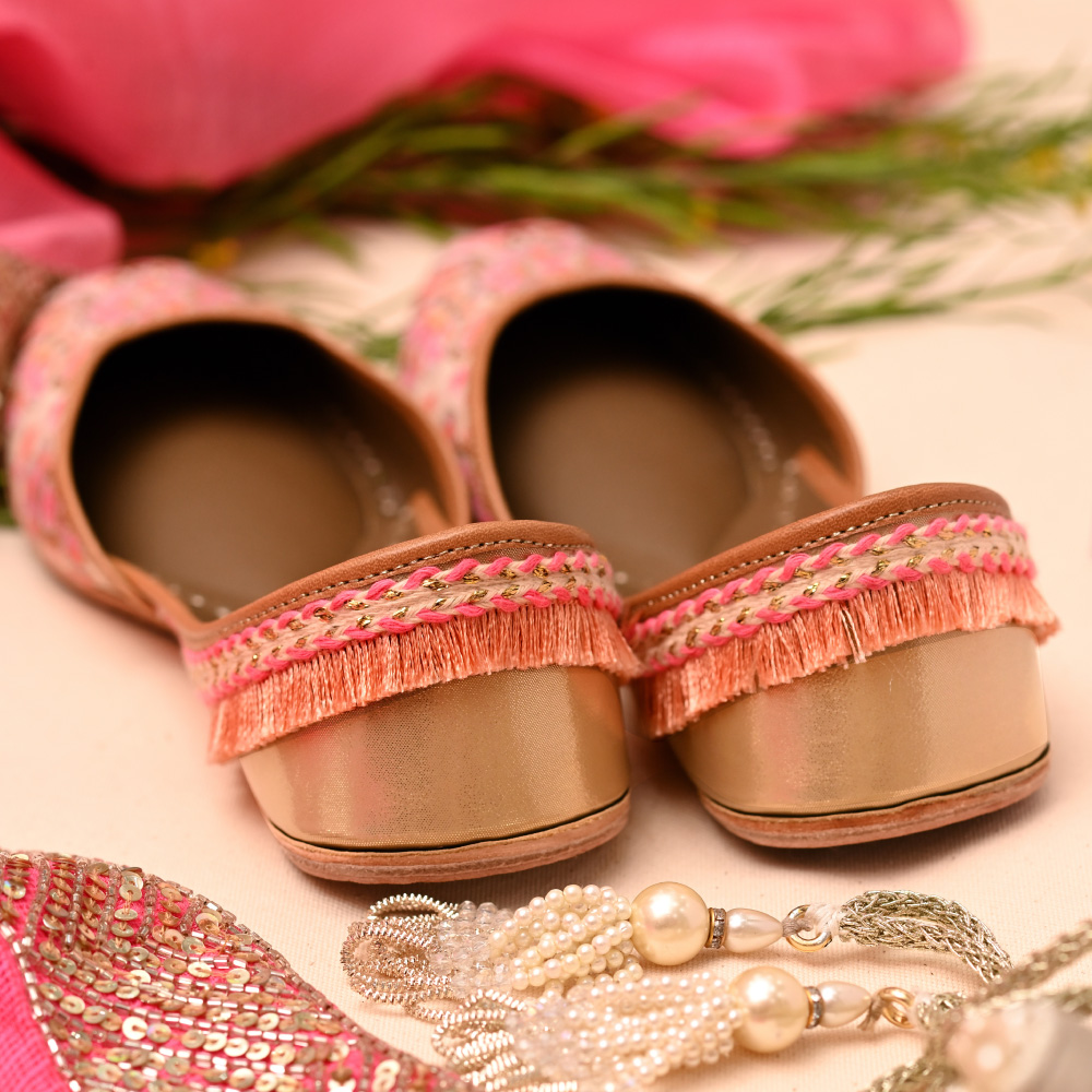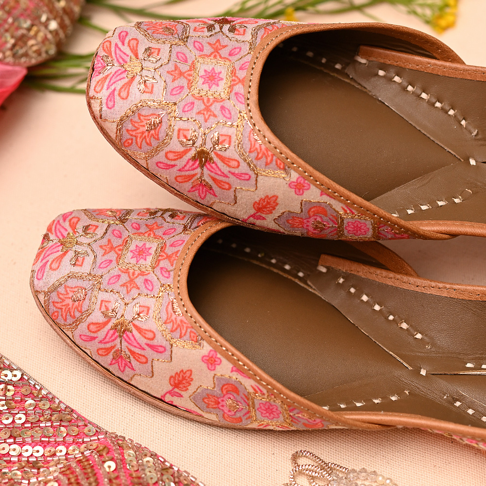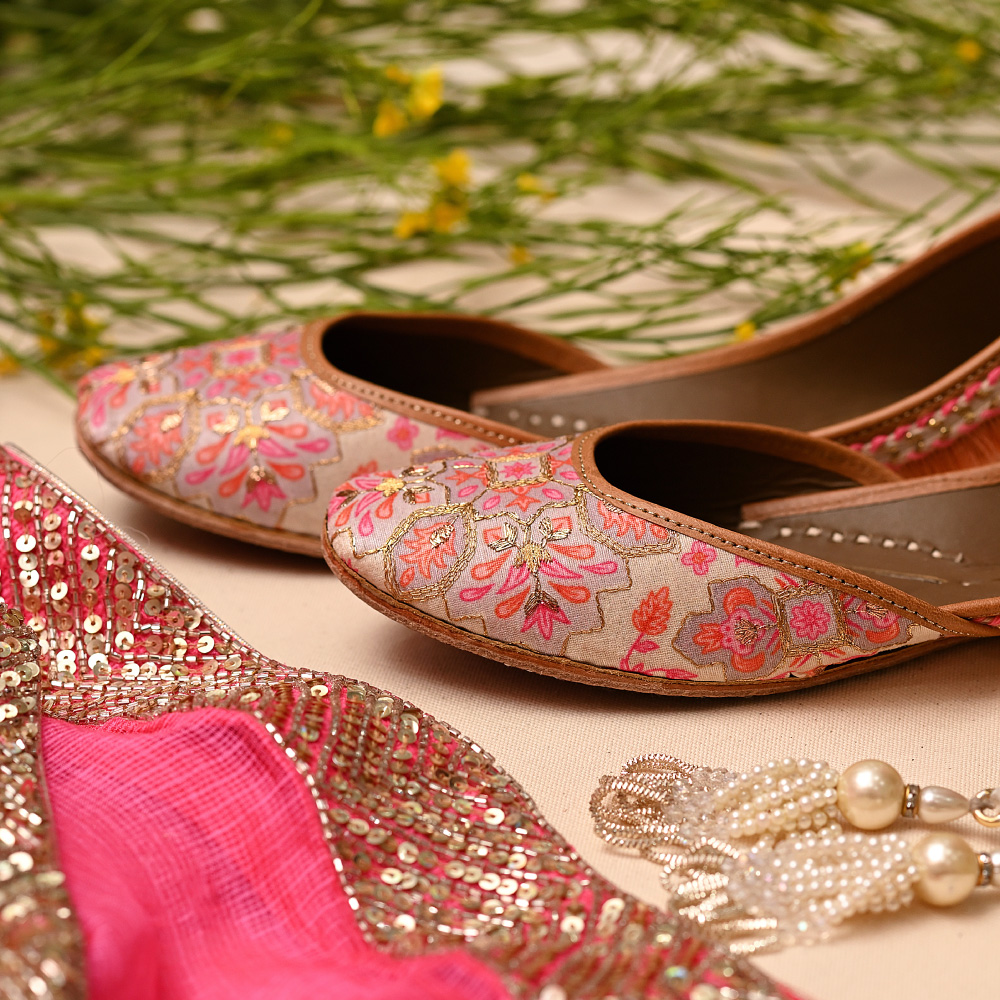 A beautiful pair of everyday Juttis, Erica has an ivory Dupion Silk upper and a gold leatherette back. The geometric floral print of the upper is highlighted using gold zari embroidery, giving this pair a stunning elevated look. The gold pops beautifully atop the sunset hues. The contrast back is finished with a fringe lace neckline in pink and orangey colours, creating some cohesiveness between the upper and the back of the shoe.