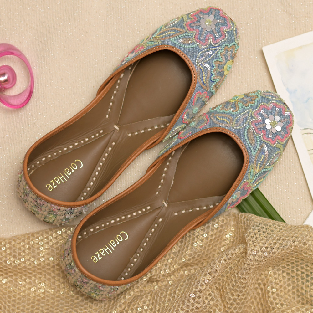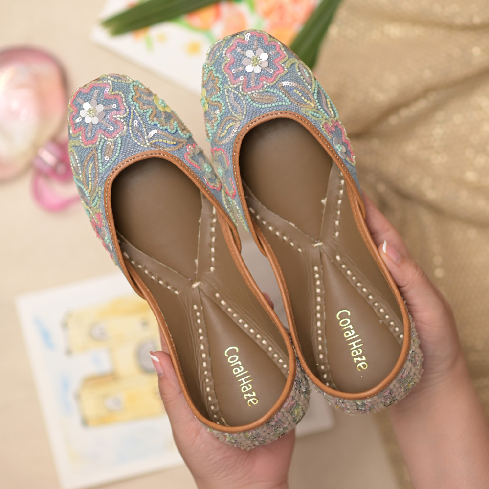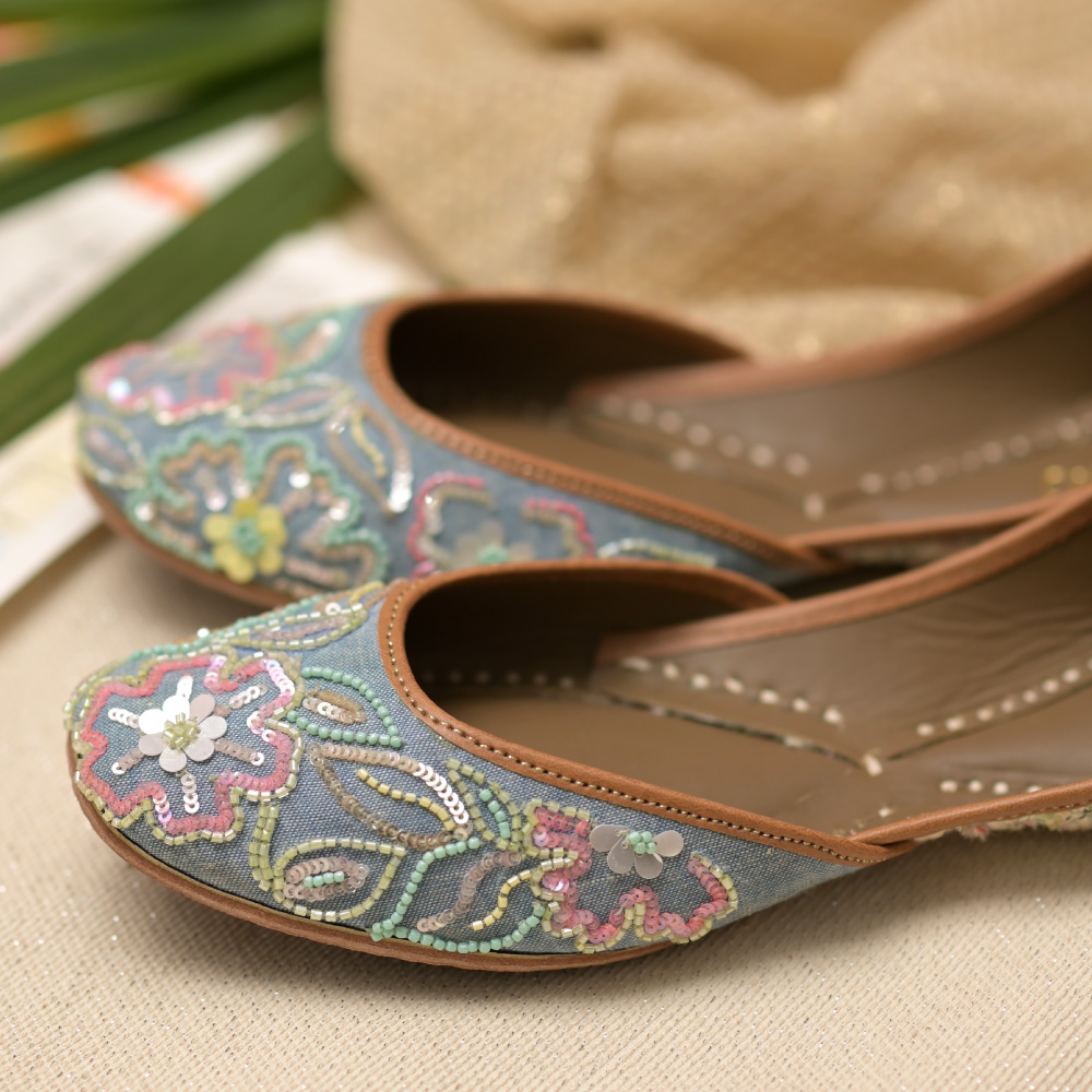 Crafted with precision, these Juttis feature a serene light blue denim base adorned with hand-embroidered pastel multi-coloured sequins and intricate beadwork, meticulously arranged to form a captivating floral masterpiece. The back features a multi-coloured tweed pattern that adds a contemporary twist to the design. Whether you’re gracing a wedding, a cultural soirée, or simply elevating your everyday style, “Grace” will be your go-to choice.